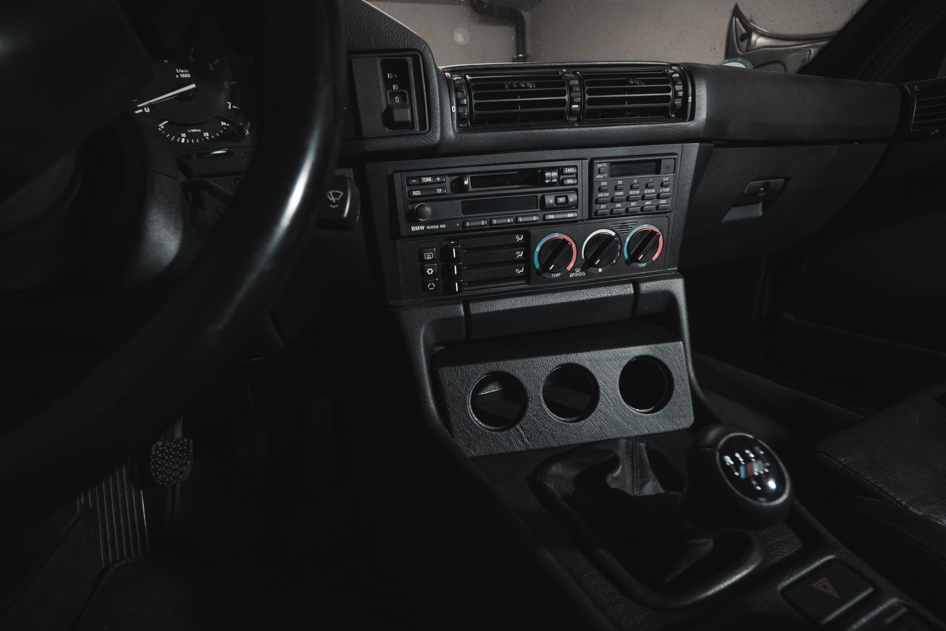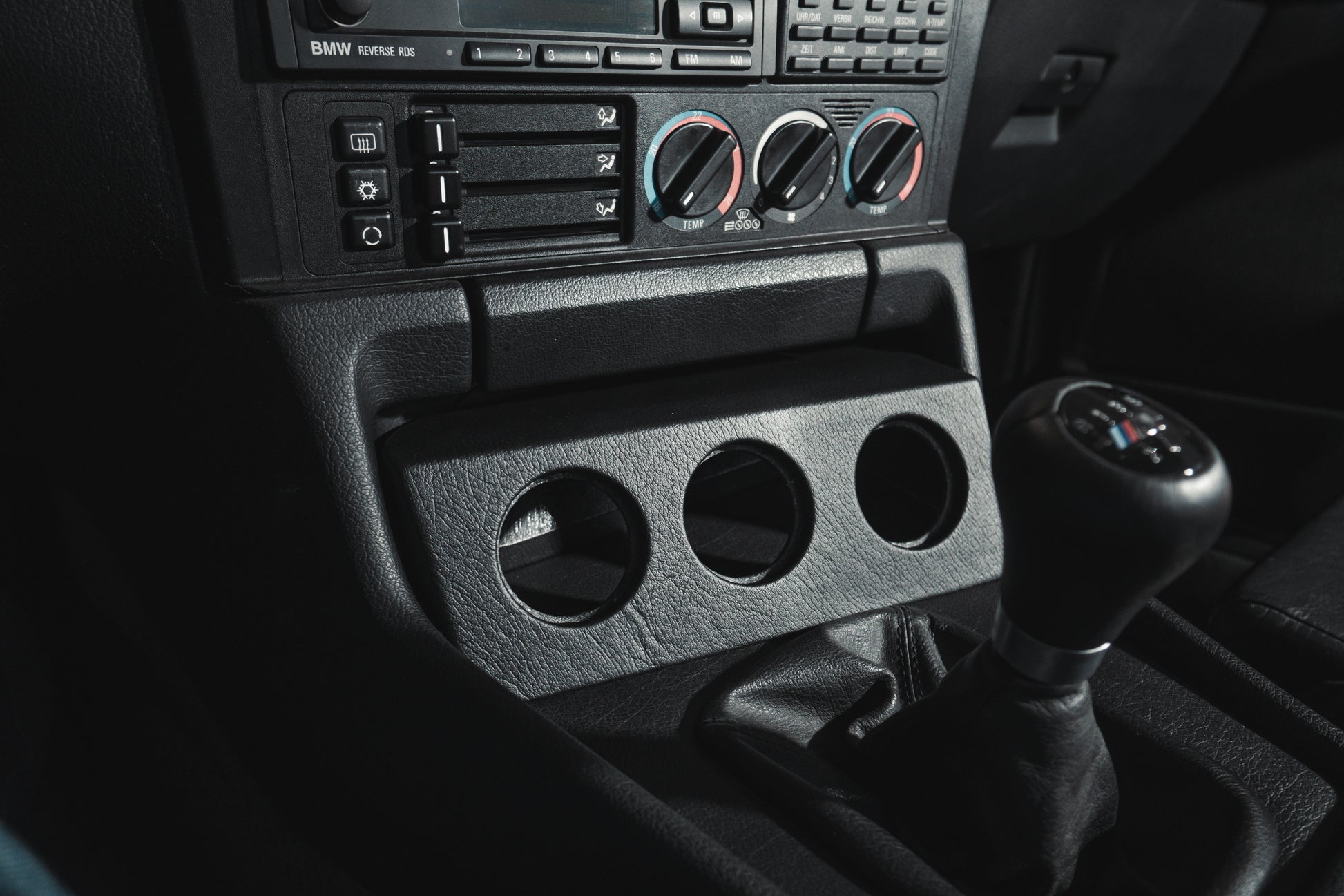 OEM+-Upgrade for the BMW E34 cockpit: three 55-mm gauge holders neatly arranged, produced to be durable and finely refined.
