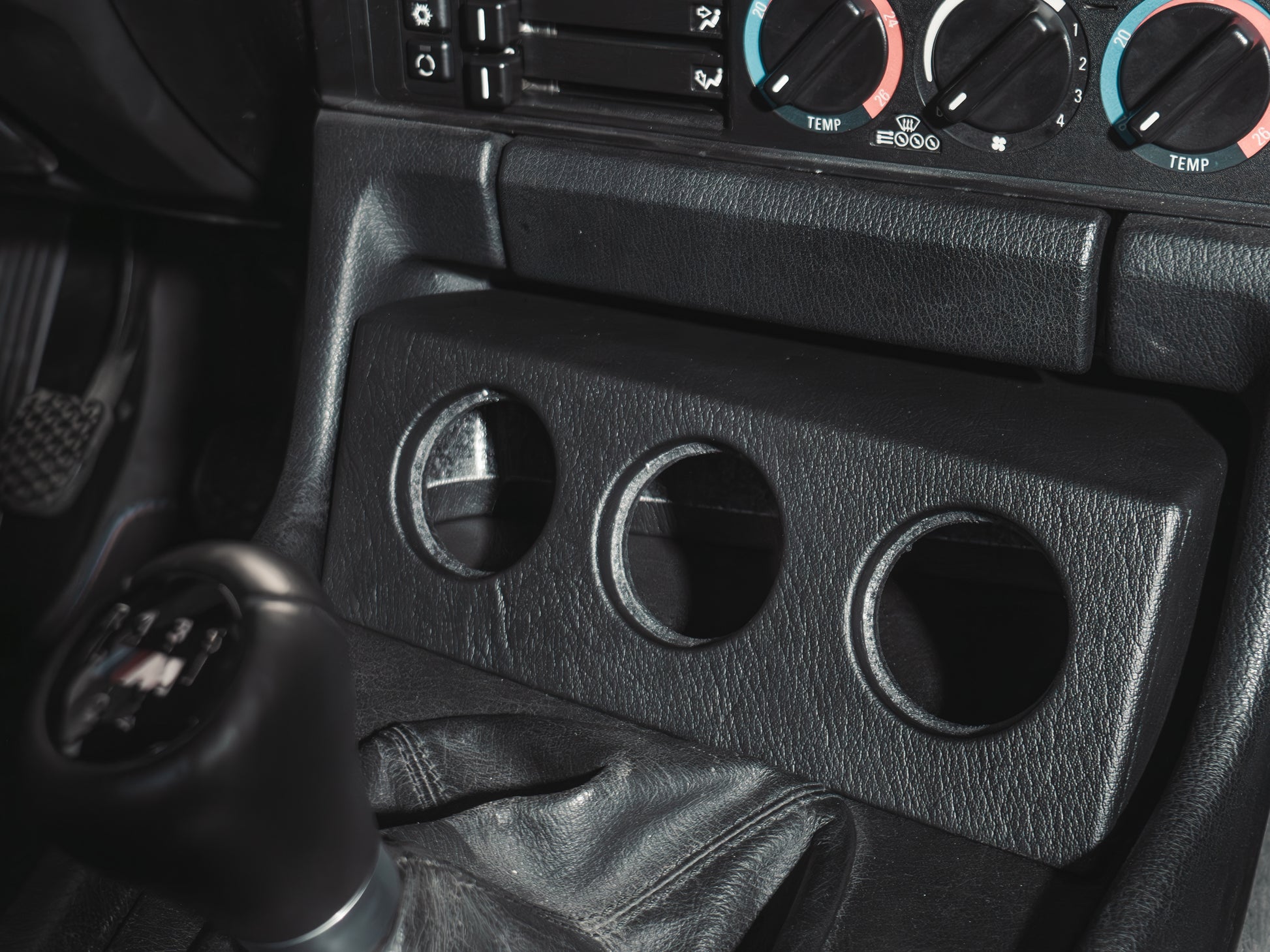 OEM+-Upgrade fürs BMW E34 Cockpit: Zusatzinstrumentenhalter für Drei 55-mm-Anzeigen sauber angeordnet, langlebig produziert und hochwertig veredelt.